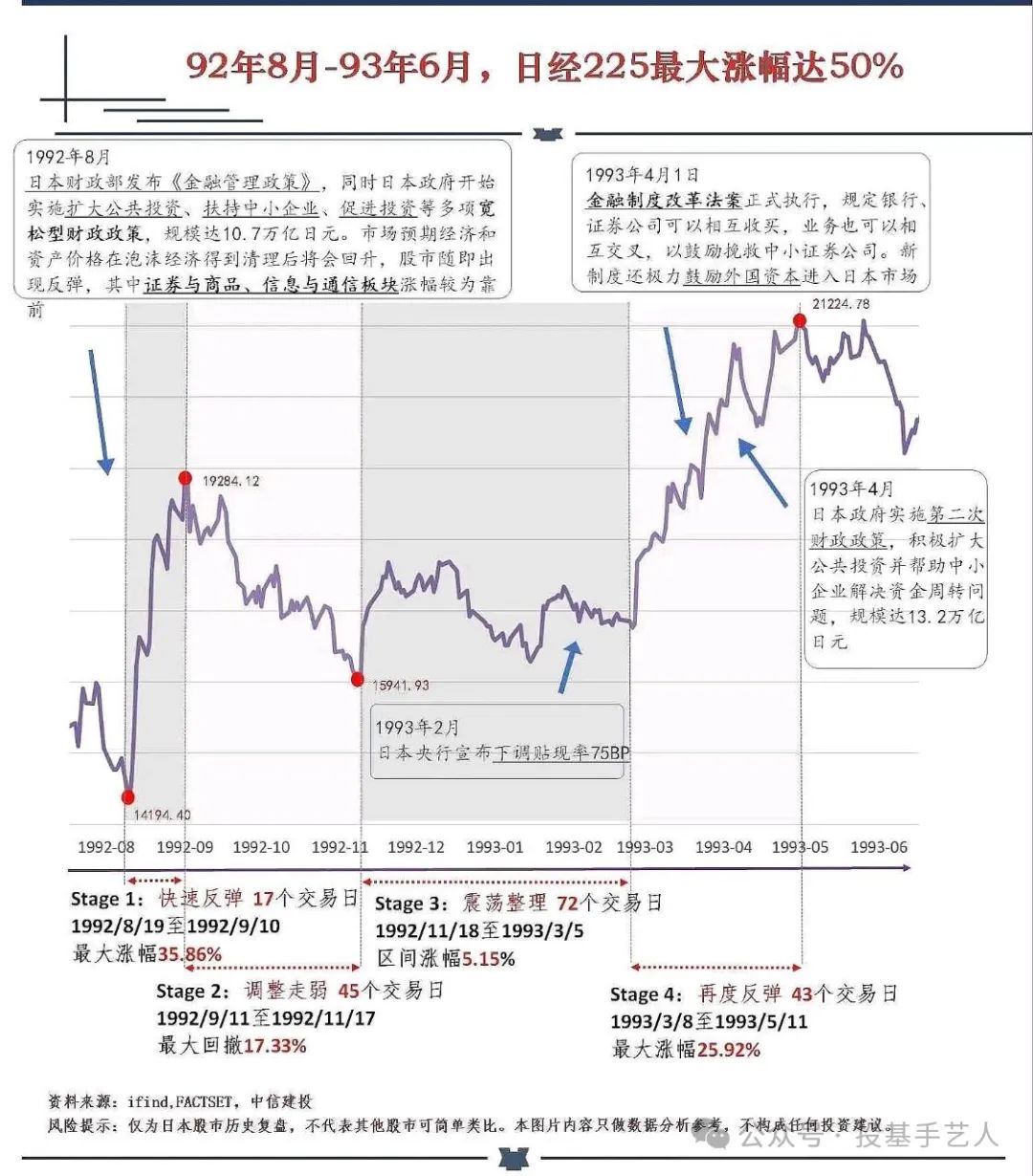 最近很多高手都在复盘,看现在的行情类似哪一个时期,2004年9月份的,2005年的,2018年的,2014年的,各种说法都有。刚好看见某券商做了个图,说得是日本92年8月之后一年的一段行情。我自己感觉从年度角度看,肯定不会类似日本的30年前的阶段,但从之后几个月的走势看,是有可能走出类似那几个季度的图形的。