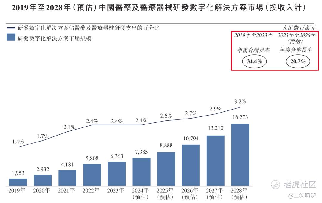 根据市场预计医药及医疗器械研发数字化解决方案市场将以20.7%年复合增长率增长至2028年的人民币163亿元,渗透率达到3.2%。