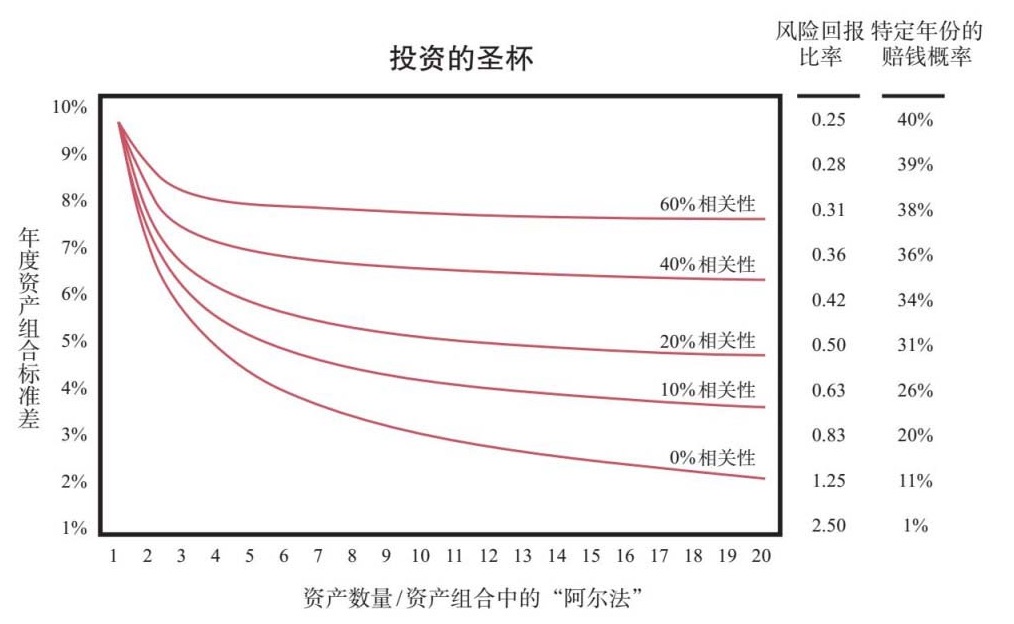 而在早期的失败经历中,达里奥意识到无论在押注时多有信心都有可能犯错,要降低风险而不降低收益,合理的多样化是关键。基于诺贝尔经济学奖哈里·马科维茨的资产组合理论和桥水内部研究,达里奥发现如果有拥有15-20个良好的、互不相关的会保留,投资能够大幅降低投资风险而不减少预期收益。这被达里奥成为“投资的圣杯”