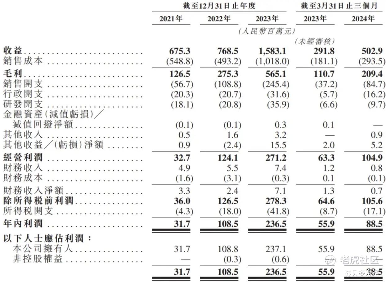 据招股书披露,卡罗特2024年第一季度的营收约为5.03亿元,较2023年同期的2.92亿元增长73.34%;净利润0.89亿元,2023年同期为0.56亿元,同比增加58.32%,整体保持增长态势。