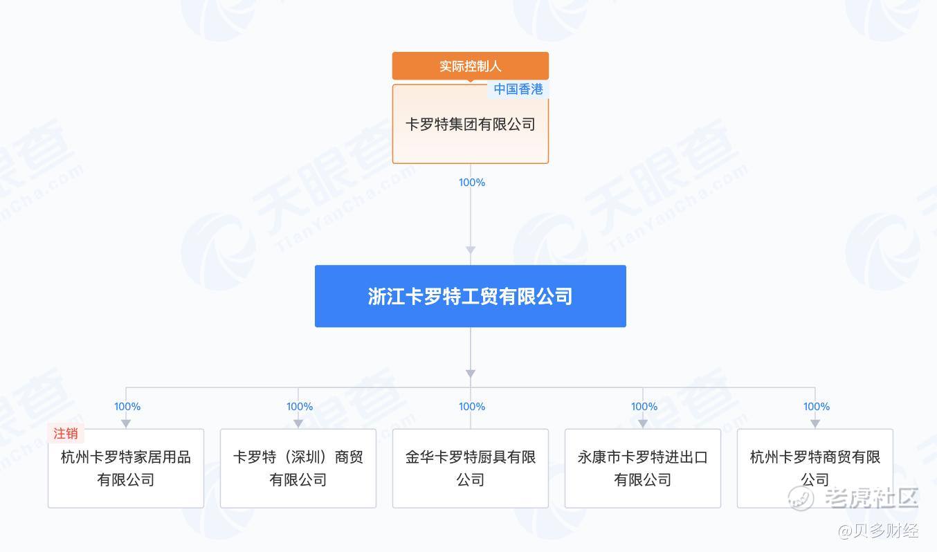 事实上,卡罗特在境内的主要经营主体为浙江卡罗特工贸有限公司。天眼查App信息显示,该公司成立于2007年4月,位于浙江省金华市永康市,注册资本约为2028.29万元,法定代表人为章国栋,全资股东为卡罗特集团有限公司。