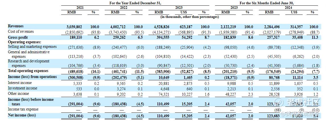 闪送的财务数据也非常亮眼。2021年到2023年,闪送的收入分别达到30.40亿元、40.03亿元及45.29亿元,年复合增长率为22.1%,保持快速增长。2024年上半年,闪送实现收入22.84亿元。而2021年到2023年,闪送的毛利分别为1.89亿元、2.59亿元及3.95亿元,对应的毛利率分贝为6.2%、6.5%及8.7%,呈上升趋势,而在2024年上半年,闪送的毛利率进一步提升至11.3%。