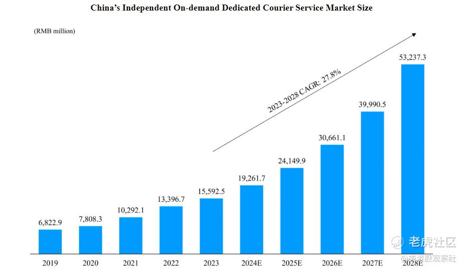 从行业层面看,即时配送满足了用户的配送需求,正覆盖到用户生活中的方方面面,而独立即时配送服务商因为其高效、便捷及灵活的特性,更容易受到用户欢迎,从而实现更快速度的增长。根据艾瑞咨询的数据,中国的独立即时配送市场规模将会在2028年达到532.37亿元,2023年到2028年的年复合增长率达到27.8%。
