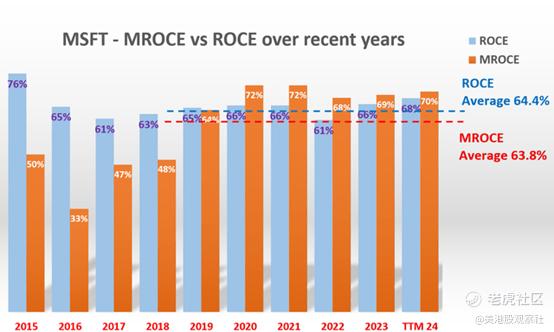 首先,每年投入的资本(“CE”)被计算出来。其次,然后计算CE的年度增量。最后,计算年度收益增量与年度CE增量之间的比率,以近似MROCE。在年度收益或投入资本出现大幅波动的年份,采用多年滚动平均值来平滑波动。结果表明,微软能够维持与平均ROCE基本相同的MROCE(63.8%对64.4%)。