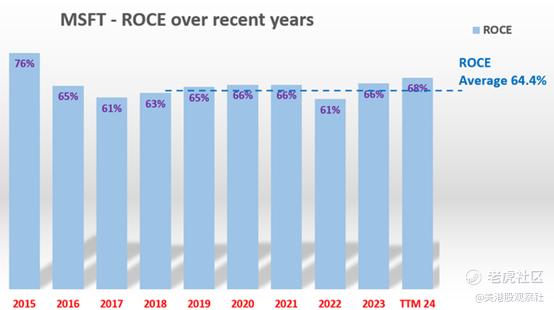好消息是,微软从根本上享有轻资本和高度可扩展的商业模式。因此,预计它将保持高资本回报率(ROCE)与其新的资本支出。下面的图表提供了历史背景。图表显示了过去十年中微软的ROCE。