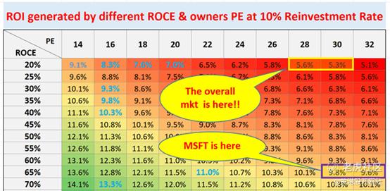 在当前条件下,微软的交易价格约为31倍前瞻性市盈率,转化为约3.2%的OEY。如前所述,平均ROCE为64.4%,假设再投资率为10%,其长期增长率预计为6.4%。因此,预计在当前条件下,微软的总投资回报率约为9~10%,这比标普500指数(约5~6%)的预期高出一大截。最后,作为微软的额外优势,平均经济的MROCE远不及微软的63.8%,因为整体经济的基本商业模式远不如微软的可扩展性(其SaaS模型和类似年金的收入流)。