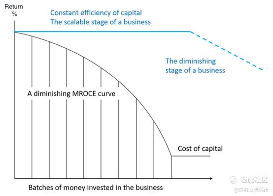 他在这里指的是投入资本的边际回报,或MROCE。企业总是会首先将资金投资于预期回报最高的资本项目。如果在这之后还有剩余资金,企业将寻找预期回报第二高的项目。以此类推。其结果是,随着MROCE的缩小,呈现出递减的回报,如下表所示。