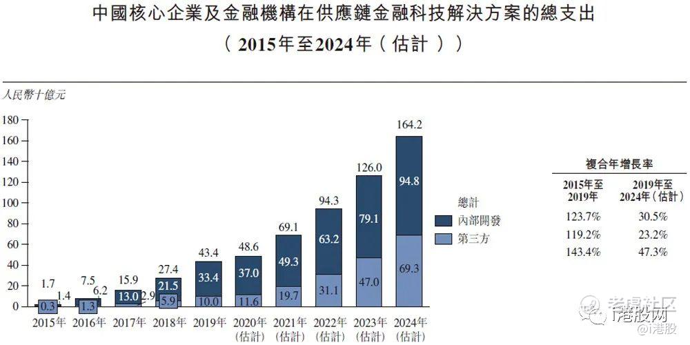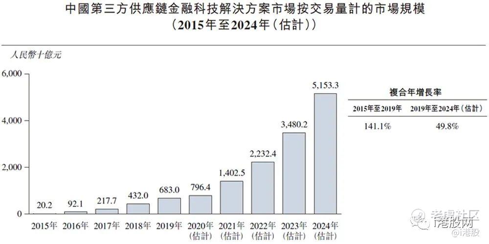 根据灼识咨询数据显示,预计2019年至2024年中国核心企业及金融机构在第三方供应链金融科技解决方案的总支出到2024年将达到493亿元,复合年增长率为47.3%,且第三方供应链金融科技解决方案的交易量市场规模的复合年增长率为49.8%。