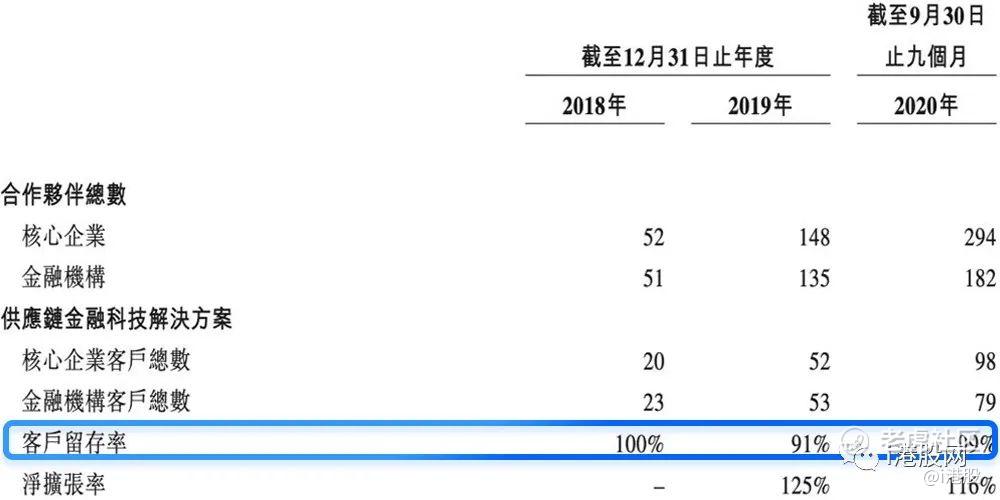 在这体系中真正做到了互惠互利,核心企业可以通过金融机构提前付款,从而降低资金成本,可与供应商协商更有利的商务条款;而中小企业供应商更快收到货款,也可以提高资金运营效率;金融机构也可以实现为中小企业提供融资的战略目标,及折价收益。故而公司2020年客户留存率高达99%。