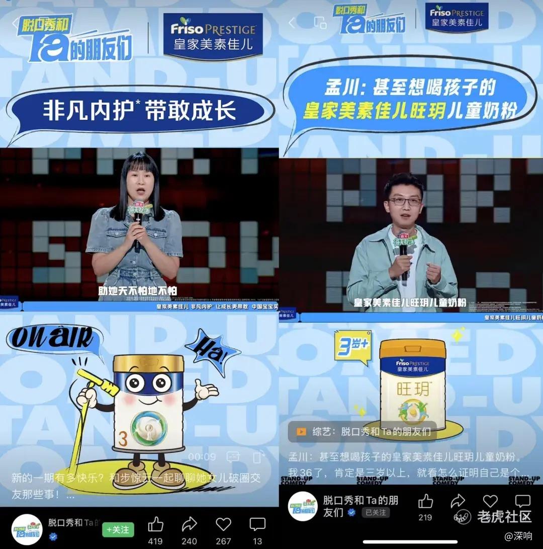 还有以“带敢成长”为品牌理念的皇家美素佳儿奶粉,此次合作则绑定了节目中的奶爸脱口秀演员孟川、哈哈曹、以及兼具母亲、演员和脱口秀俱乐部老板多重身份的演员步惊云合作。他们在脱口秀表演中谈及孩子在幼儿园、在社交中的趣事,自然就融入了皇家美素佳儿【带敢成长】、【成长没什么不可以】等品牌一直所倡导的育儿理念。这种结合演员真实育儿经历和体验的植入结合,将品牌理念诠释得非常鲜活生动而且自然。
