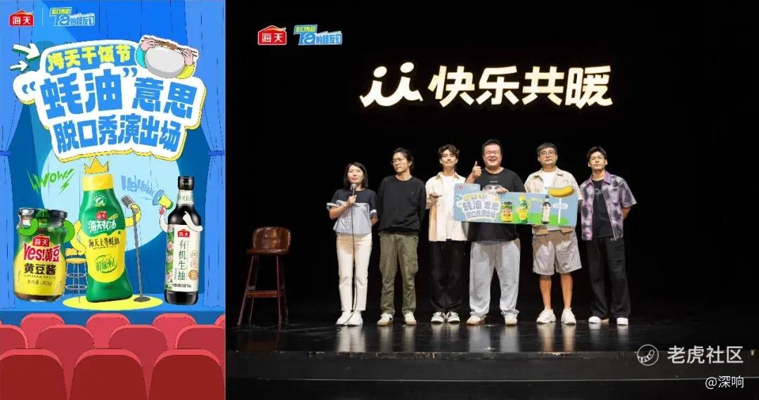 另外,白洪羽还提到了一点,腾讯脱口秀还建立起了一条完整的全链路的营销价值体系,包括艺人经纪、定制衍生内容、mini脱口秀、线下演出、IP授权等等,品牌可以叠加多种丰富营销玩法,形成节目内外打通、线上线下整合的营销策略,为品牌的影响力和生意增量助力。比如在线下,海天蚝油就联动代言人毛豆及节目热门脱口秀演员,举办了海天“蚝油”意思脱口秀演出专场,让快乐从线上延续到线下,深度“宠粉”,提升品牌好感度。