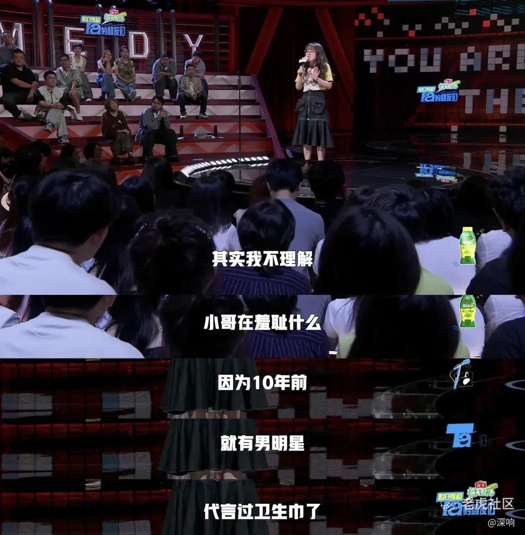 同样在节目中大放异彩的新人菜菜就讲述了一个有强共鸣但却是“隐性禁忌“话题——月经羞耻。当她将男性不敢直说、不敢在超市货架前停留、卫生巾必须要找黑色塑料袋装等司空见惯的现象摆上台来讲时,我们才体会到了这种陈旧观念给女性带来了多大的心理障碍。