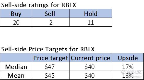下面的表格概述了Roblox的卖方评级和价格目标。
