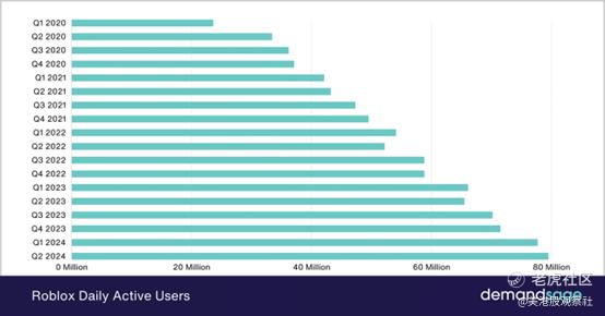 该公司上季度的预订量轻松超出了市场预期,报告了9.552亿美元,而共识为9.0176亿美元,该公司预计预订量将达到10亿至10.25亿美元,再次超过市场预期的9.73亿美元。修订后的预订指引的积极因素还没有计入股价。预订是关注Roblox的关键指标,它与他们的日活跃用户(DAU)指标密切相关,后者上个季度同比增长了21%,达到了7950万,平均每月独特付费用户同比增长了22%,达到了1650万。Roblox的DAU自20年第一季度以来以令人印象深刻的速度扩张,如下图所示;预计DAU在24财年下半年将轻松并可持续地超过8000万。该公司还超过了指引,尽管报告称其每DAU平均预订在本季度持平,大约为12.01美元,这是由于用户地理分布的不利因素。每DAU平均预订有增长的空间,得到新的商业化机会的支持。