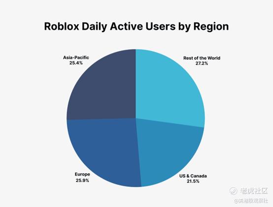 第二个应该带来更多上行空间的机会是国际市场的牵引力。Roblox在美国和加拿大的核心市场增长最快,第二季度标志着“自21年第一季度以来的最快增长”。但日本和印度也作为关键的增长市场出现,日本是最大的游戏市场之一。日本参与时间同比增长了66%,印度同比增长了60%。截至第二季度,大约一半的Roblox用户位于美国、加拿大或欧洲,而52.58%位于亚太地区和其他国际市场。国际市场的收入在2025财年将成为Roblox总业务的更大一部分。下面的图表概述了按地区分布的Roblox用户。