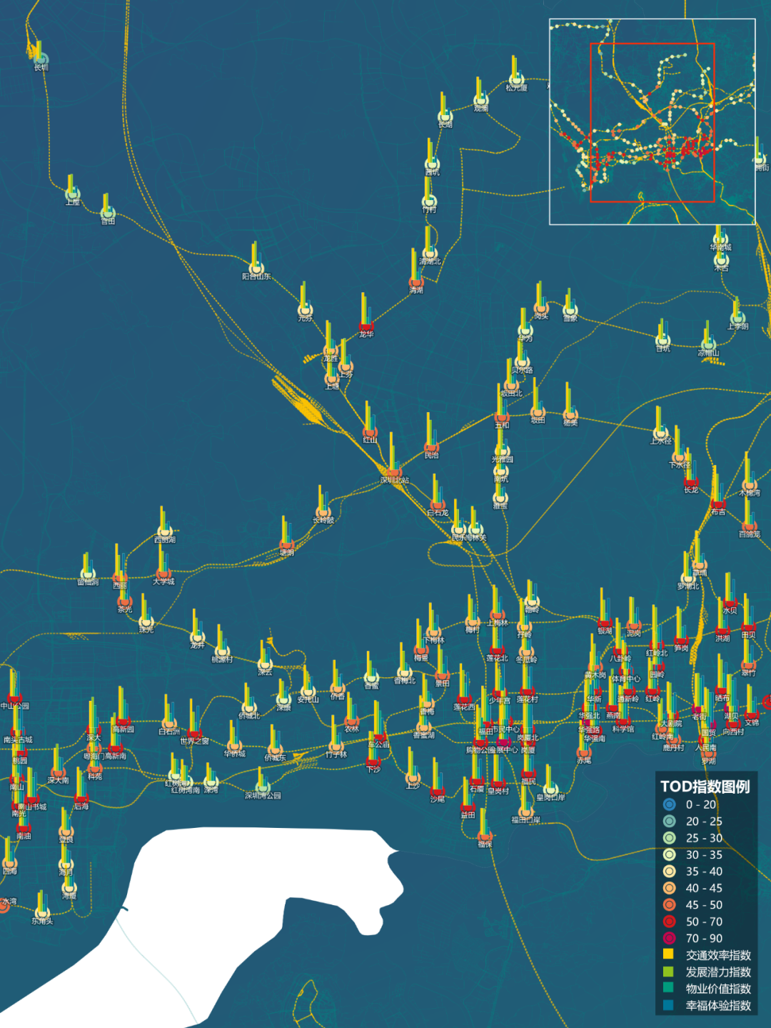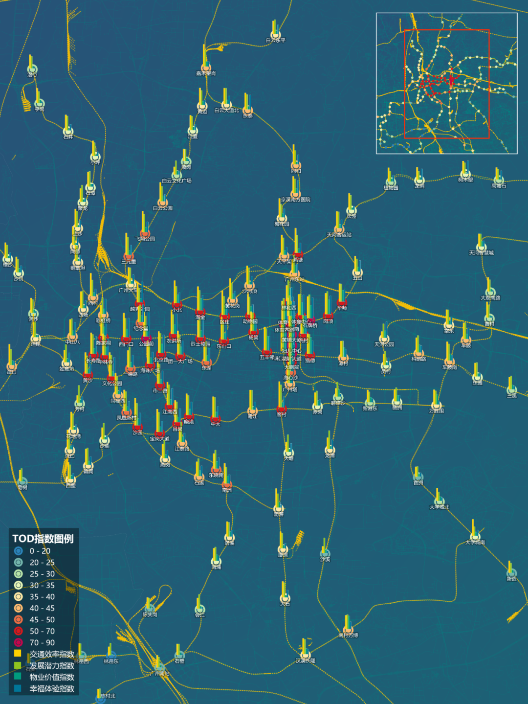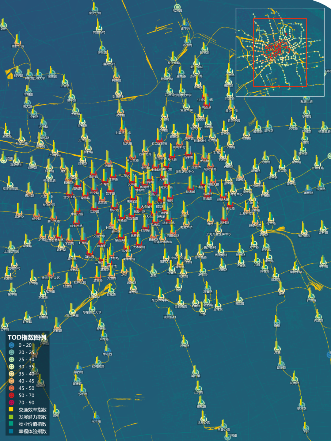 下图为根据最新站点TOD指数的成果制作的城市TOD热力地图示意,城市TOD热力区域一目了然。