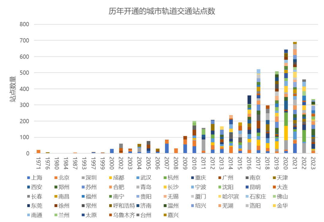 2023年,新开通运营轨道交通站点的数量低于2022年新增数量,说明新开通运营轨道交通的增速开始放缓。