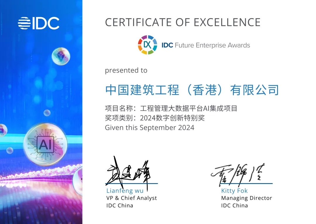 近日,IDC中国在上海举办2024 IDC中国年度峰会暨颁奖典礼。中国建筑国际集团(以下简称“中国建筑国际”)旗下中国建筑工程(香港)有限公司(以下简称“中建香港”或“公司”)凭借在工程管理领域的数字创新实践,荣获IDC中国区“2024数字创新特别奖”,是唯一获奖的中国区建筑企业。同时,中建香港信息化业务负责人李雁飞荣获“年度数字化转型CIO大奖”。