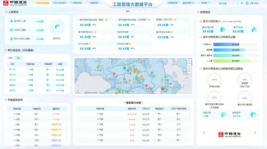 本次获奖项目——工程大数据平台AI集成项目,核心内容包括中建香港“驾驶舱”、工程公司“驾驶舱”及数据消费中心。项目通过整合管理招标、成本、合约、进度、物资、安环、质量、机械等多环节数据资料,运用物联网、云计算、AI等先进技术,既可以优化项目管理流程,也可以提升数据驱动的决策能力。该项目可以有效增强工程管理的精确性和安全性,推动低碳建造的发展,为建筑行业数字化转型提供强有力的支撑。