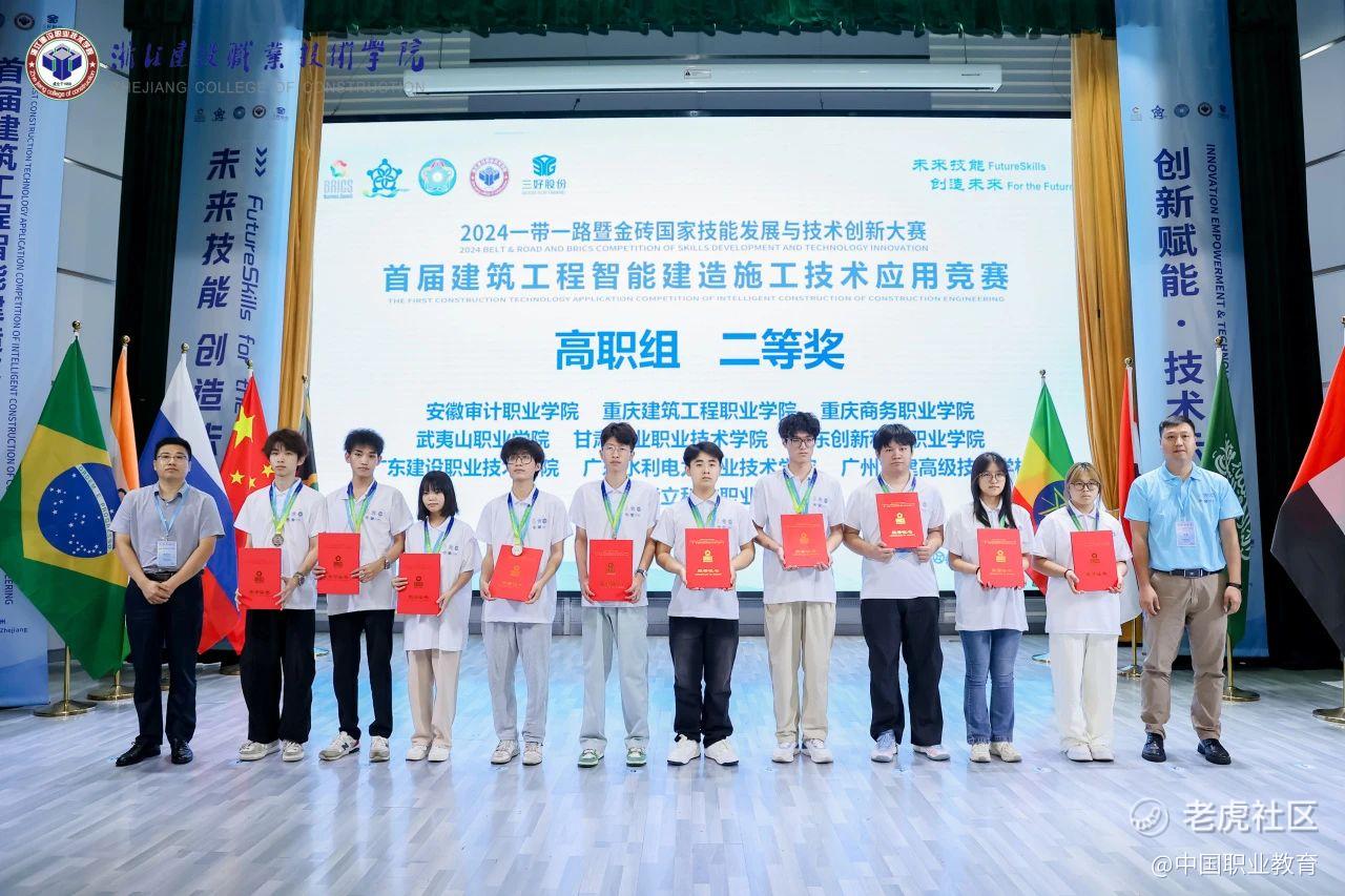 近日,2024一带一路暨金砖国家技能发展与技术创新大赛首届建筑工程智能建造施工技术应用赛项(BRICS-ST-027)全国总决赛在浙江杭州举办。本次决赛汇聚了来自全国28个地区382所院校的415支队伍,共计1500余名优秀选手参赛。其中孟加拉国、加纳共和国及马来西亚的6名国际留学生也参与其中。经过激烈角逐,中国职业教育控股有限公司(「公司」,股票代码:1756.HK)旗下广州华立科技职业学院(「华立职业学院」)城建学院学生徐文生、黄梓焕脱颖而出,荣获全国二等奖的佳绩,指导教师乔亮、甘英浩被授予“优秀指导教师”荣誉称号。此外,学校凭借前期周密细致的组织工作,赢得了组委会的高度认可,并荣获“优秀组织奖”。