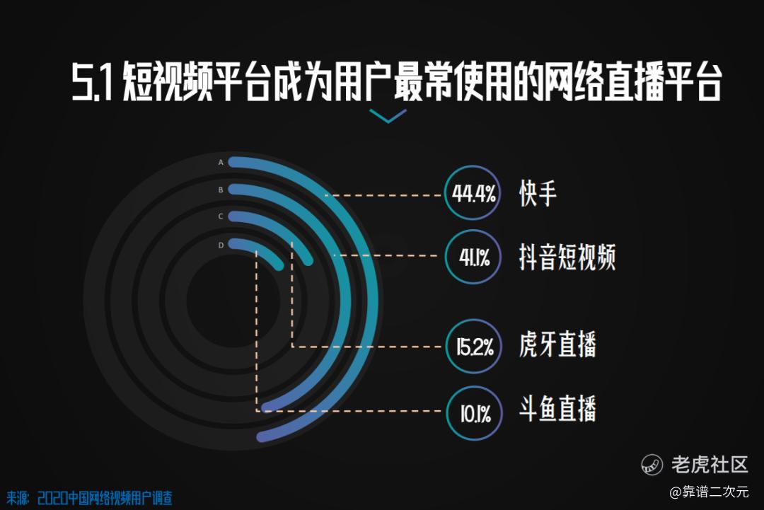 短视频平台已经成为用户最常使用的网络直播平台,44.4%用户看快手直播,41.1%用户看抖音直播,相比之下,只有15.2%的用户看虎牙直播,10.1%的用户看斗鱼直播。
