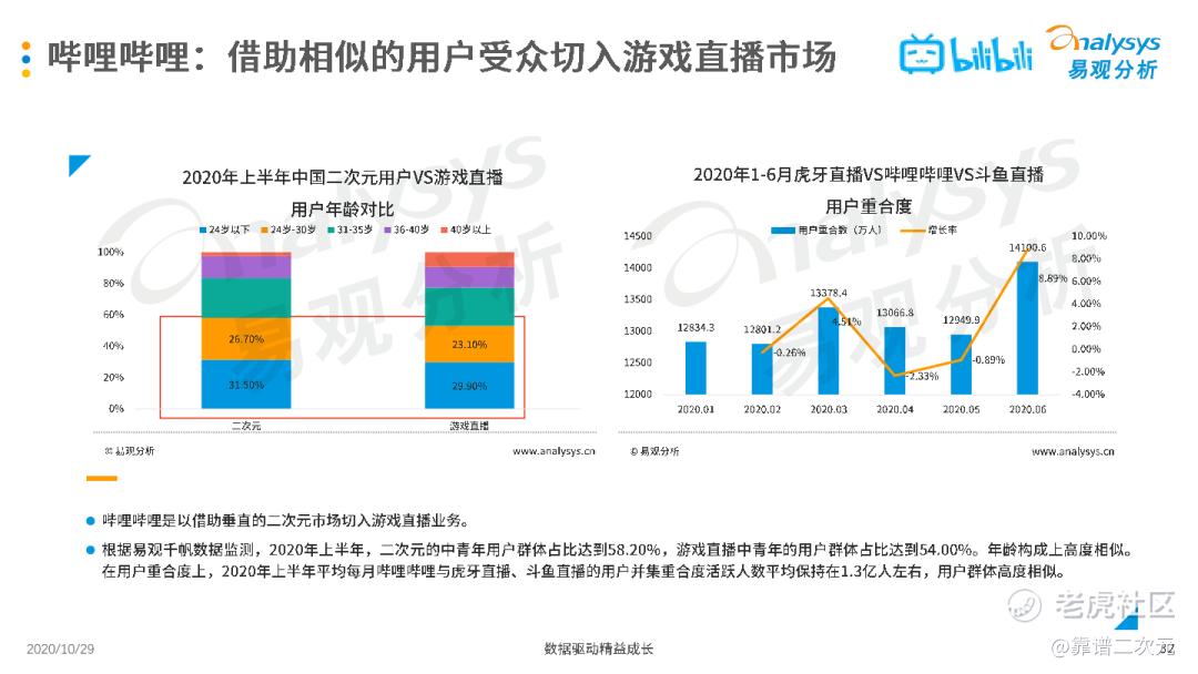2020年Q2斗鱼虎牙月活用户合计3.3亿。根据易观的游戏直播报告数据,截止2020年6月,B站与斗鱼、虎牙的重合用户有1.4亿,这项数据仍有增长趋势。