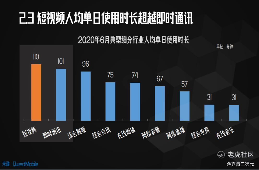 更恐怖的是,短视频的用户规模和使用时长在2020年仍然在增长,显然是抢夺了其他APP的潜在增量。数据显示网络直播类APP的人均单日使用时长在2019年底是57分钟,在2020年6月依旧是57分钟。虎牙CEO曾表示,2019年Q3虎牙移动端日均观看时长为100分钟,2020年Q1为107分钟,勉强持平。