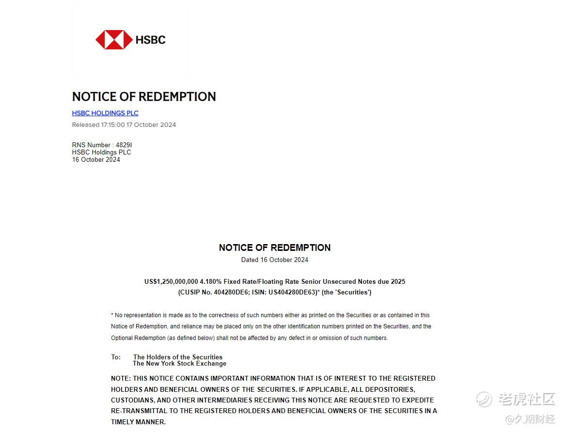 久期财经讯,10月16日,汇丰控股有限公司(HSBC Holdings PLC,简称“汇丰控股”,00005.HK)发布赎回公告,兹涉及息票率4.180%、可变利率、1,250,000,000美元高级无抵押票据(ISIN:US404280DE63)(以下简称“证券”)。