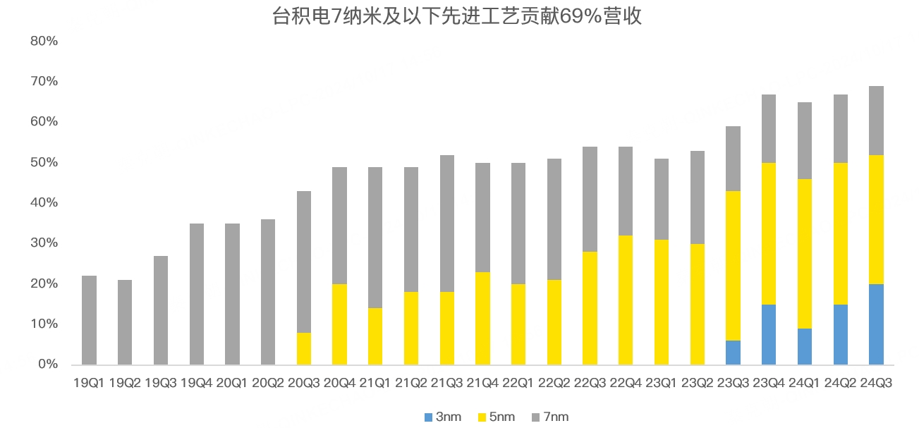 AI芯片主要集中在先进制程上,今年三季度,3纳米工艺贡献了20%的营收;5纳米为32%;7纳米为17%,先进制程合计贡献了69%的营收,创历史记录: