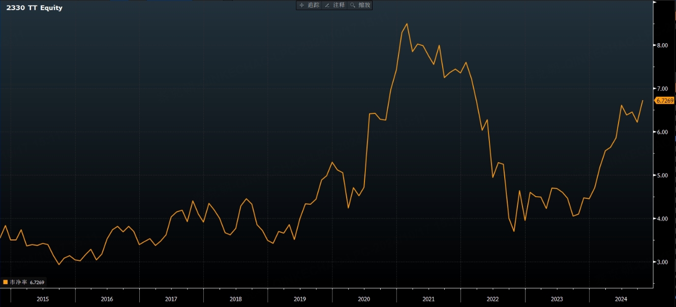 从估值上看,台积电当下的市净率仍低于上一轮半导体景气周期高点,或预示着台积电终将站稳万亿美元市值!