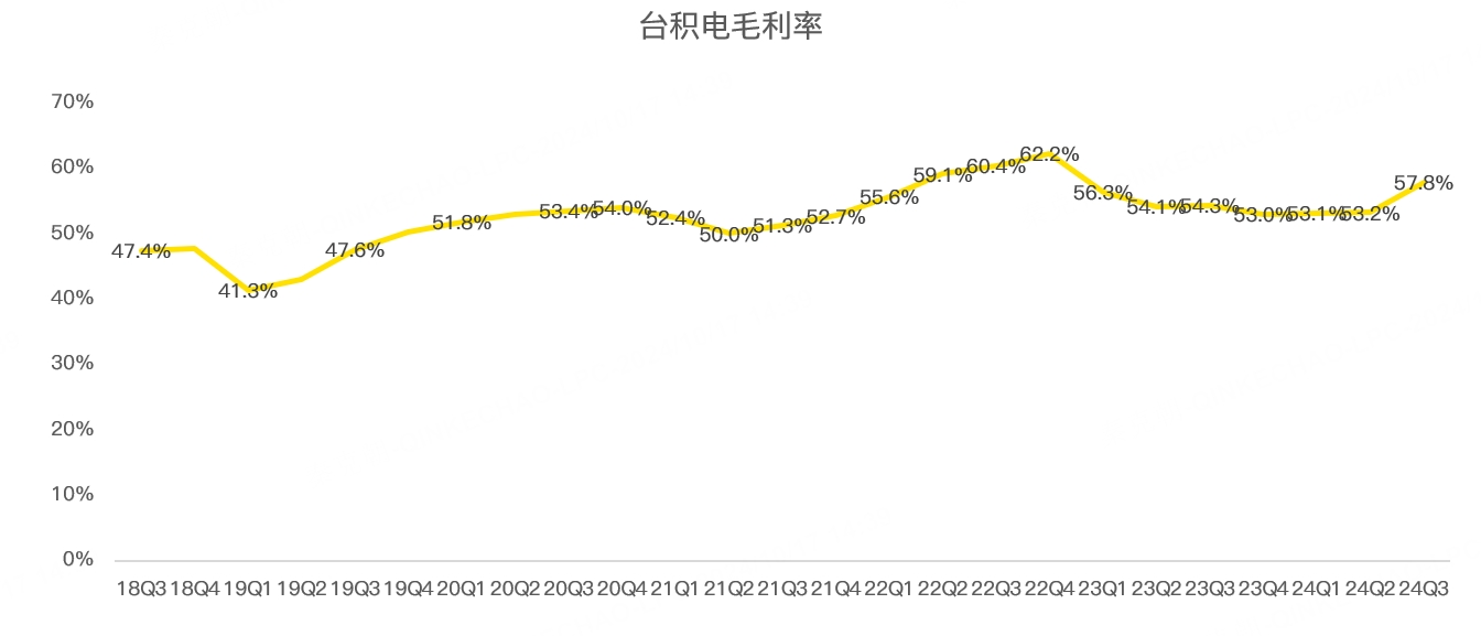 得益于先进制程放量和产能利用率的提升,台积电的毛利率大超预期,而且,展望四季度,台积电预计毛利率在57%-59%之间,大超分析师预期的54.7%!