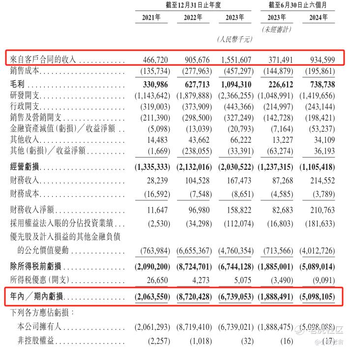 公司从2021~2023年营收分别是4.67亿、9.06亿、15.52亿,2023年营收同比增长71.32%;2021~2023年的净利润分别是-20.64亿、-87.2亿,-67.39亿,2023年的净利润同比亏损收窄22.72%。