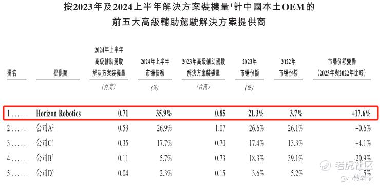 公司是中国前五大高级辅助驾驶和高阶自动驾驶解决方案提供商中唯一一家中国企业。根据灼识谘询的资料,按2023年及2024年上半年解决方案装机量计算,我们为中国本土OEM的第二大及最大高级辅助驾驶解决方案提供商,市场份额分别为21.3%及35.9%。按2023年及2024年上半年解决方案总装机量计算,我们亦为中国第四大及最大高级辅助驾驶和高阶自动驾驶解决方案提供商,市场份额分别为9.3%及15.4%。