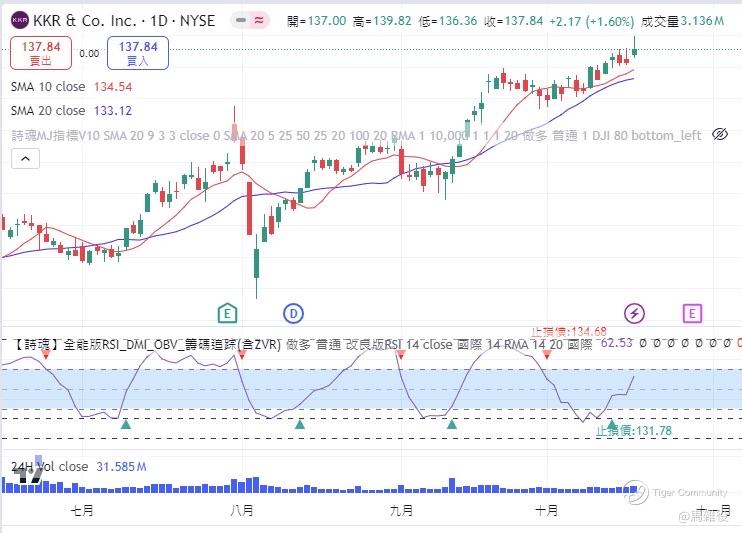 今次想介绍只金融股 - KKR。14/10出现买入讯号,17/10确认升势。可能系有人偷步,配合一下下周四的业绩公布。值得在$135-137买入。