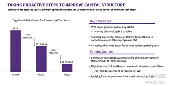 Wolfspeed已经预测,在当前的25财年,资本支出将大幅减少。该公司计划支出12亿至14亿美元的资本支出,随后在26财年仅为2亿至6亿美元,具体取决于获得资金和订单的情况。