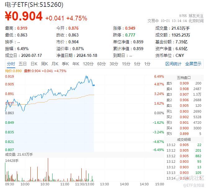 今日(10月21日)午后,半导体发力猛攻,涨幅表现居前,截至发稿,中芯国际领涨14.04%,沪硅产业上涨11.75%,景嘉微上涨10.54%。热门ETF方面,一基双拼“半导体+消费电子”的电子ETF(515260)震荡上攻,场内价格盘中涨超6%,现涨4.63%,冲击日线2连阳!