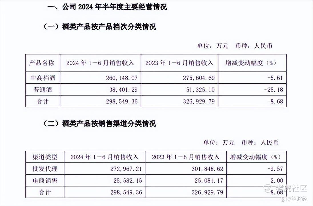 从最直接的业绩反馈来看,在经历了3年的业绩失速之后,舍得酒业开始进入负增长时代。2024年上半年,实现营收32.71亿元,同比下降7.28%;归母净利润5.91亿元,同比下降35.73%,这也是自2020年以来舍得酒业首次陷入营利双降的局面,盈利规模和质量双双跌入冰点。