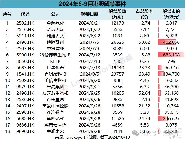 其中,科伦博泰生物-B(6990.HK)、速腾聚创(2498.HK)、第四范式(6682.HK)、宜明昂科-B(1541.HK)的解禁市值分别达68.3亿、46.2亿、24.7亿、13.5亿港元,解禁股份占总股本比例分别达15.88%、58.82%、24.74%、63.49%。