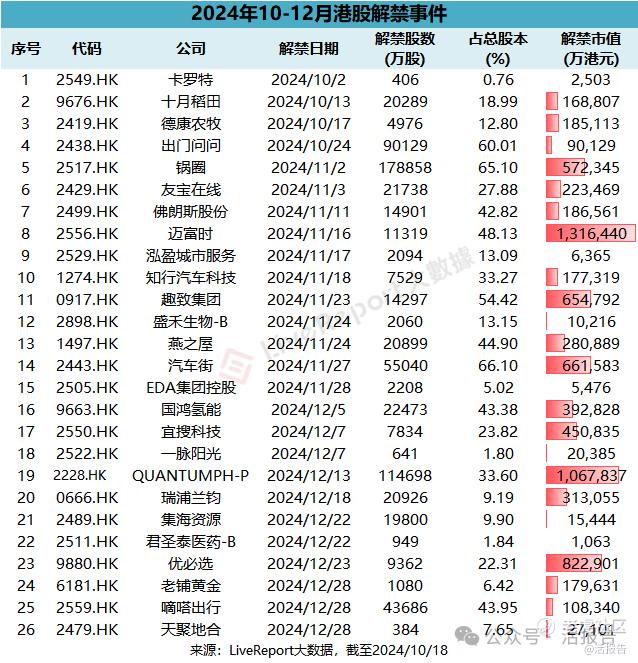 据LiveReport大数据统计,未来三个月内,还有26只个股将迎来股份解禁。按10月18日收盘价计,这些股份的合计解禁金额达到了794亿港元。