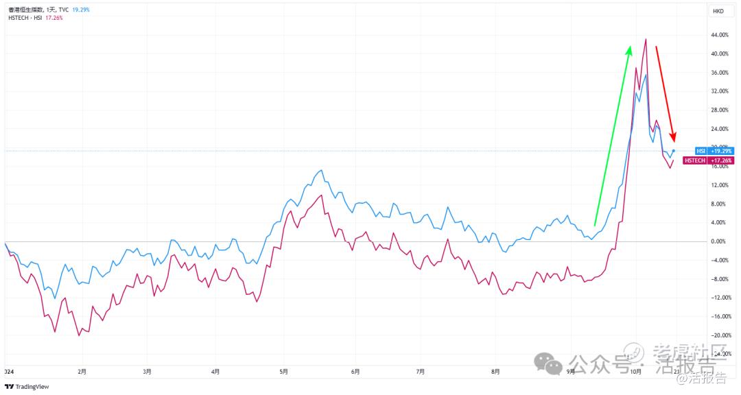 大规模刺激预期暂时落空的情况下,市场波动剧烈,大市成交也明显缩量。恒生指数从10月8日的约6200亿港元成交额回落至2000亿港元水平,增量资金的流入开始走弱,市场来到了行情博弈阶段。