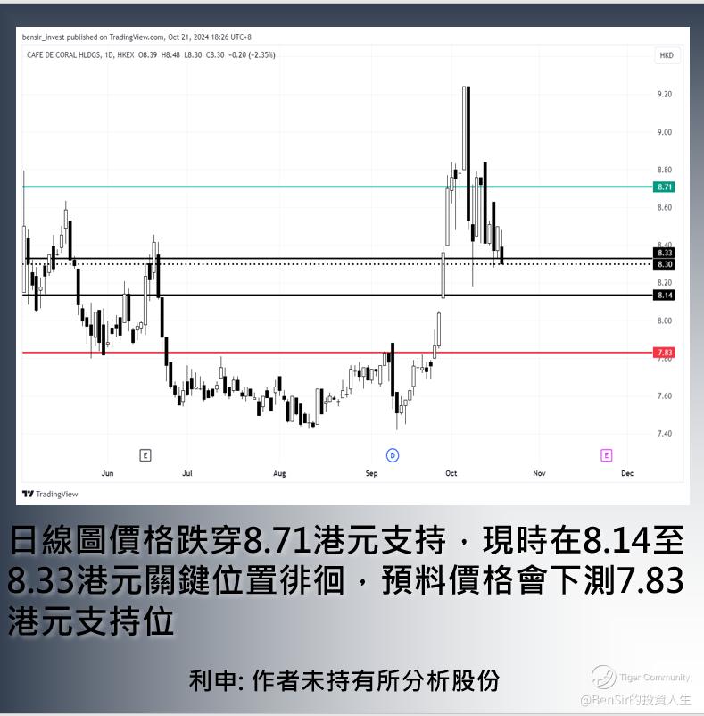 [走势分析] 日线图价格跌穿8.71港元支持,现时在8.14至8.33港元关键位置徘徊,预料价格会下测7.83港元支持位