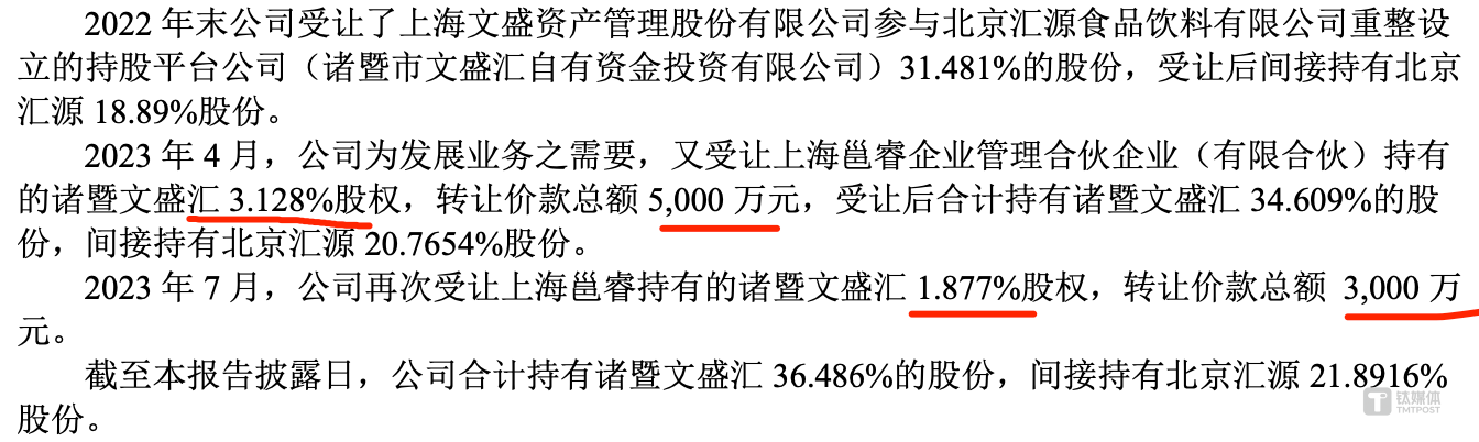 公开资料显示,国中水务于2022年4月与不良资产处理机构上海文盛资产管理股份公司(以下简称“文盛资产”)签署《项目合作协议》,拟共同投资重组后的北京汇源。之后,文盛资产作为重整投资人,投入16亿元取得北京汇源控制权,并设立诸暨文盛汇直接持股60%。同年12月27日,国中水务再次以8.5亿元对价自文盛资产受让诸暨文盛汇31.481%股份,间接持有北京汇源18.89%的股份。2023年4月和7月,国中水务又两次共计出资8000万元,将在诸暨文盛汇持股比例提升到至36.48%,间接持有北京汇源的股份则增至21.89%。