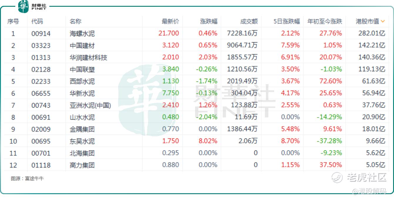 而在另一边, $淮北绿金股份(02450)$ 、 $华新水泥(06655)$、华润建材科技(01313.HK)、 $中国建材(03323)$ 、海螺水泥(00914.HK)等多只建材股已经在今年取得了亮眼的股价表现,其中西部水泥年内累涨了72.6%,海螺水泥、华新水泥、华润建材科技也都涨超20%。