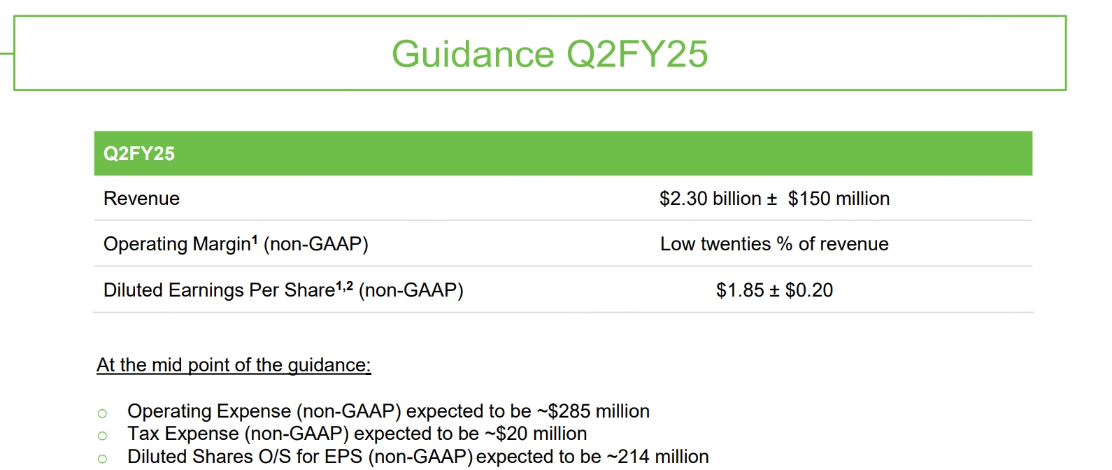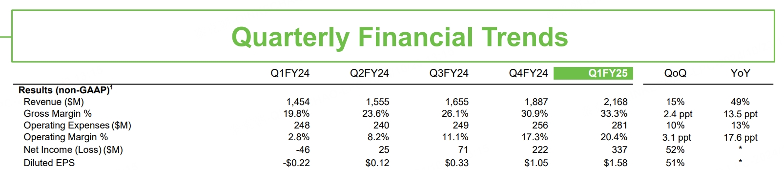 其中,FY25Q1营收21.68亿美元,同比大增49%,超过分析师预期的21.3亿;调整后毛利率33.3%,超过分析师预期的32%,创10年来记录;调整后净利润3.37亿,超过分析师预期的3.08亿,同比扭亏为盈: