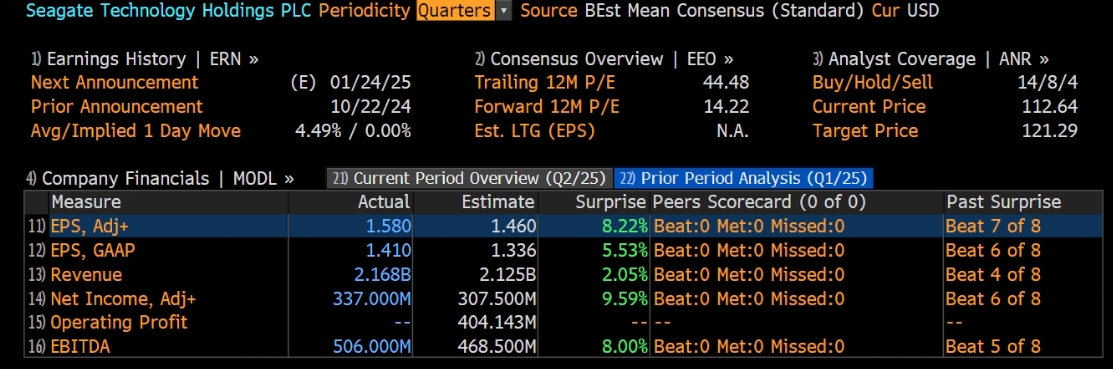昨日美股盘后,硬盘巨头希捷公布了2025财年一季报,对应截止9月27日的三个月成绩单,业绩炸裂,股价却在盘后交易中大跌5%: $希捷科技(STX)$