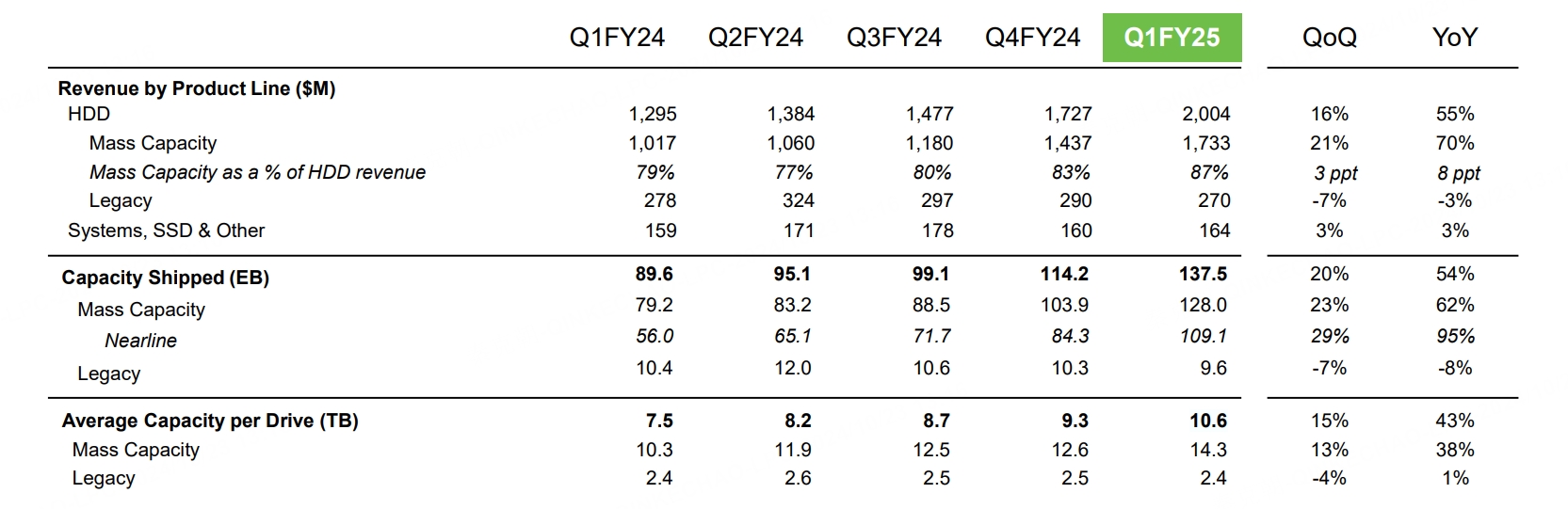 从结构上看,大容量存储在FY25Q1中贡献了17.3亿美元的收入,占HDD的比例高达87%,同比增长了70%。