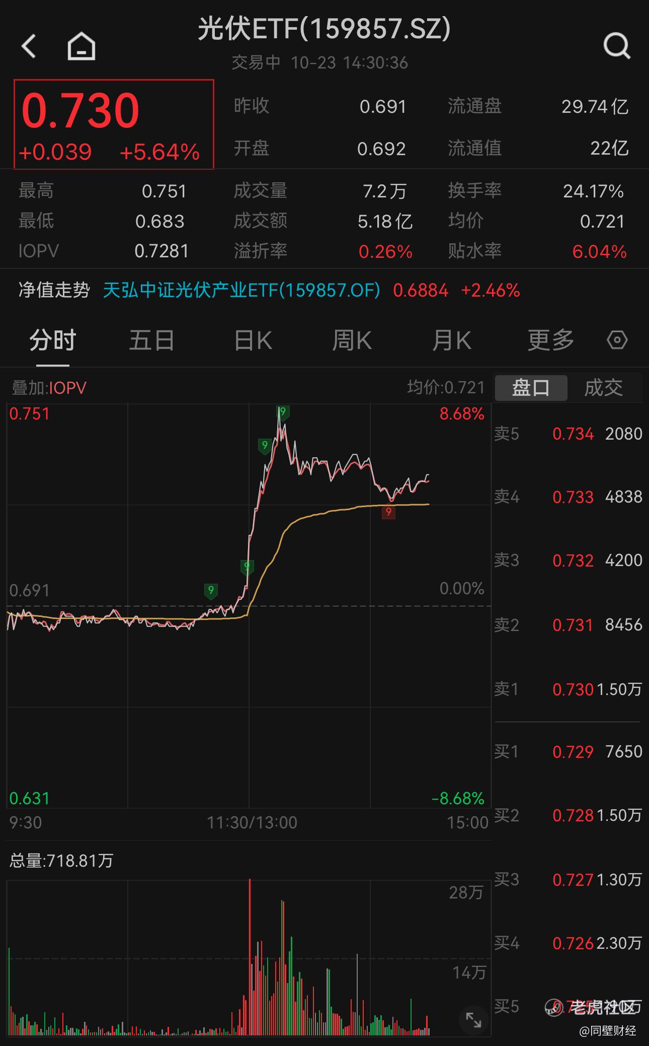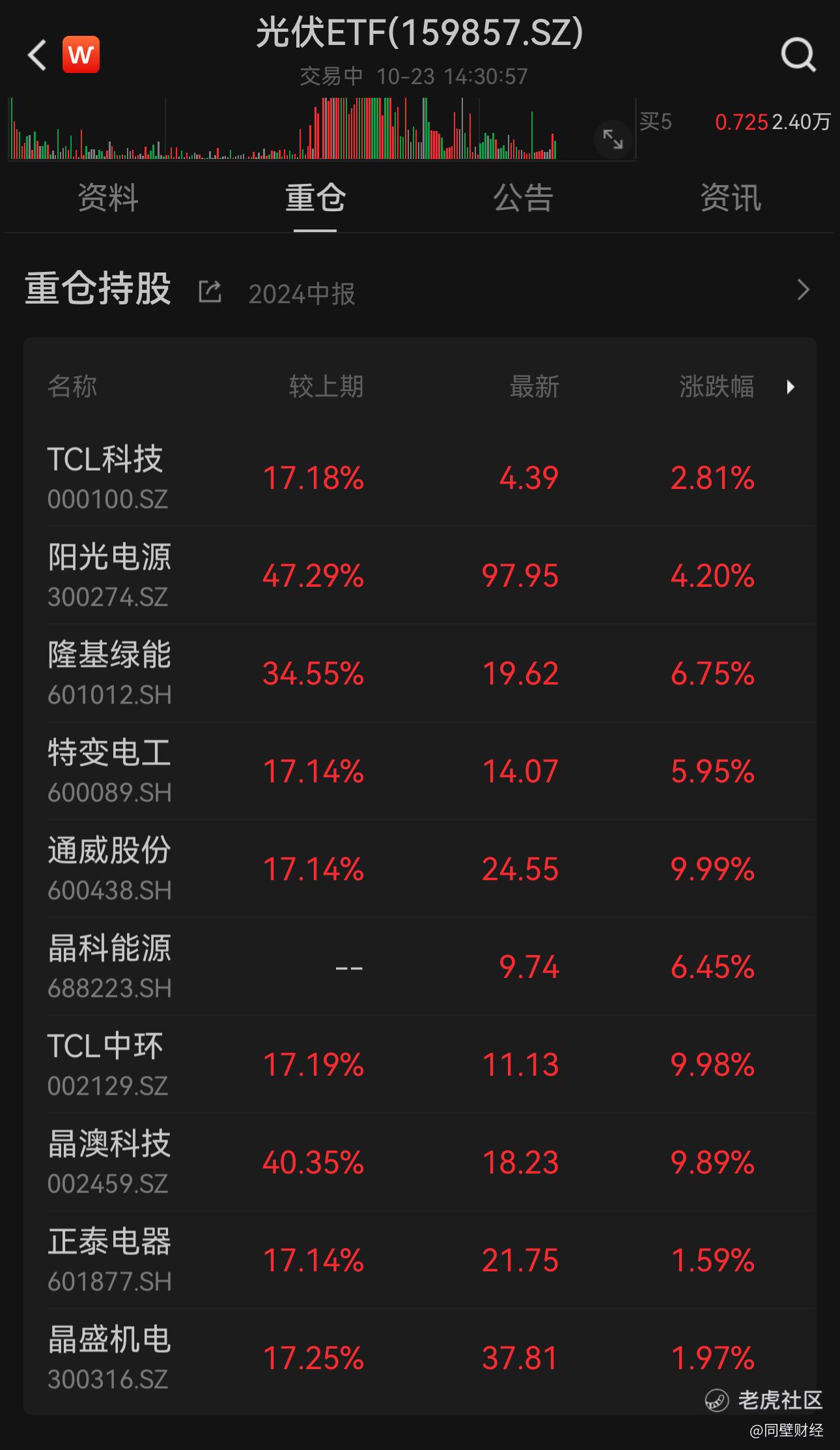 光伏概念股大幅拉升,截至14:30,光伏ETF(159857)大涨5.64%,冲击四连阳,十大重仓股集体上涨,通威股份、TCL中环涨停,晶澳科技涨超9%,隆基绿能、特变电工等个股跟涨。