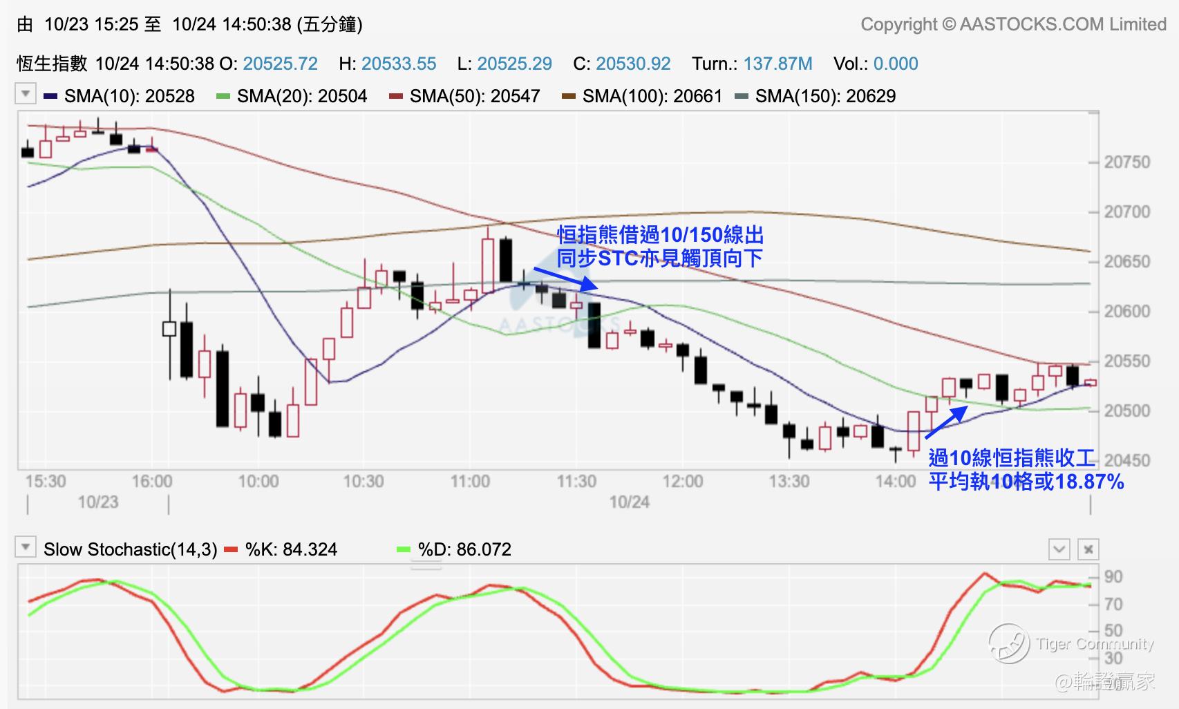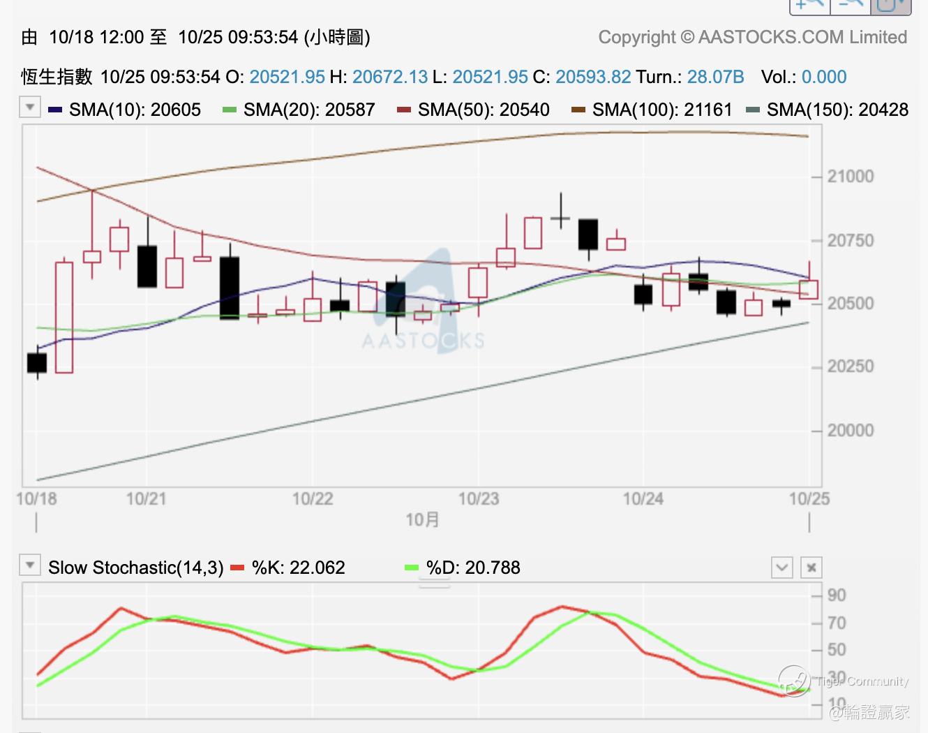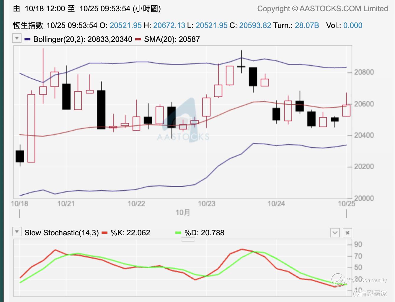 依家9点53分, $恒生指数(HSI)$ 高开高走后依家见升幅略为收窄,小时图上见指数有上过10/20/50线,但因为升幅缩咗嘅关系,所以目前得返条上影线喺度,Slow STC(14.3)两线数值上已经见到触底;盖目前保历加通道口仍然保持横行,Swing Trade捉触底似乎有机。