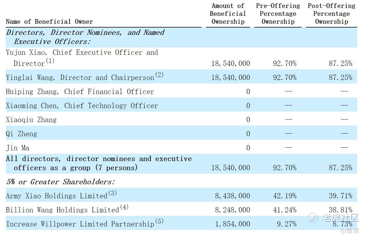 IPO前,公司CEO Yujun Xiao(肖玉军)持股为42.19%,董事长Yinglai Wang(王迎来)持股为41.24%,Increase Willpower Limited Partnership持股为9.27%。