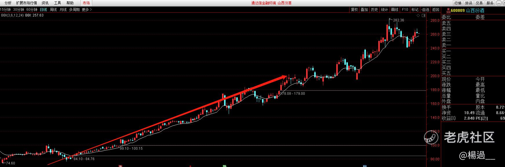 案例:山西汾酒,上升趨勢保持較好,沿著多空均線穩步向上,類似的品種沒有必要急著賣。